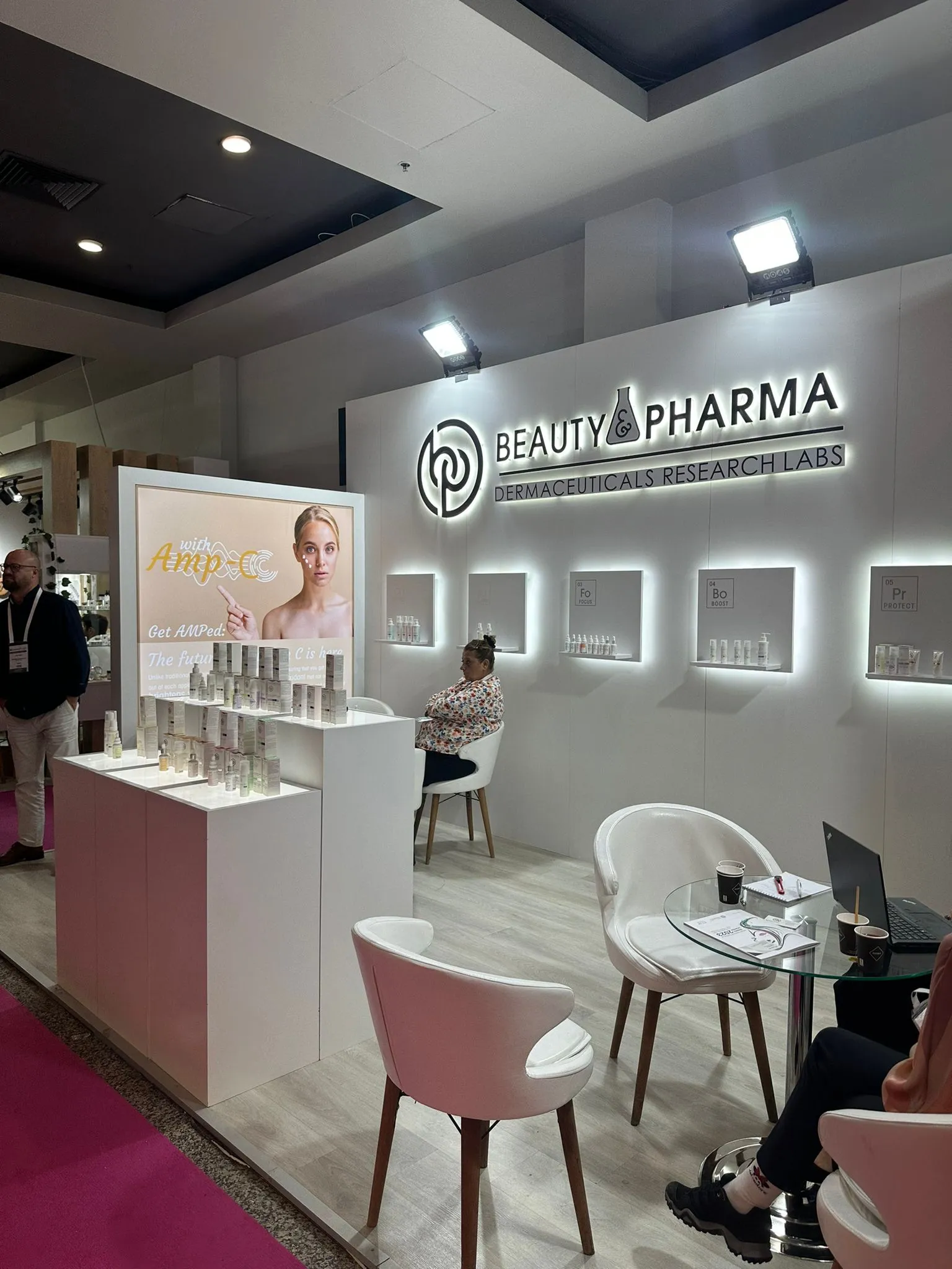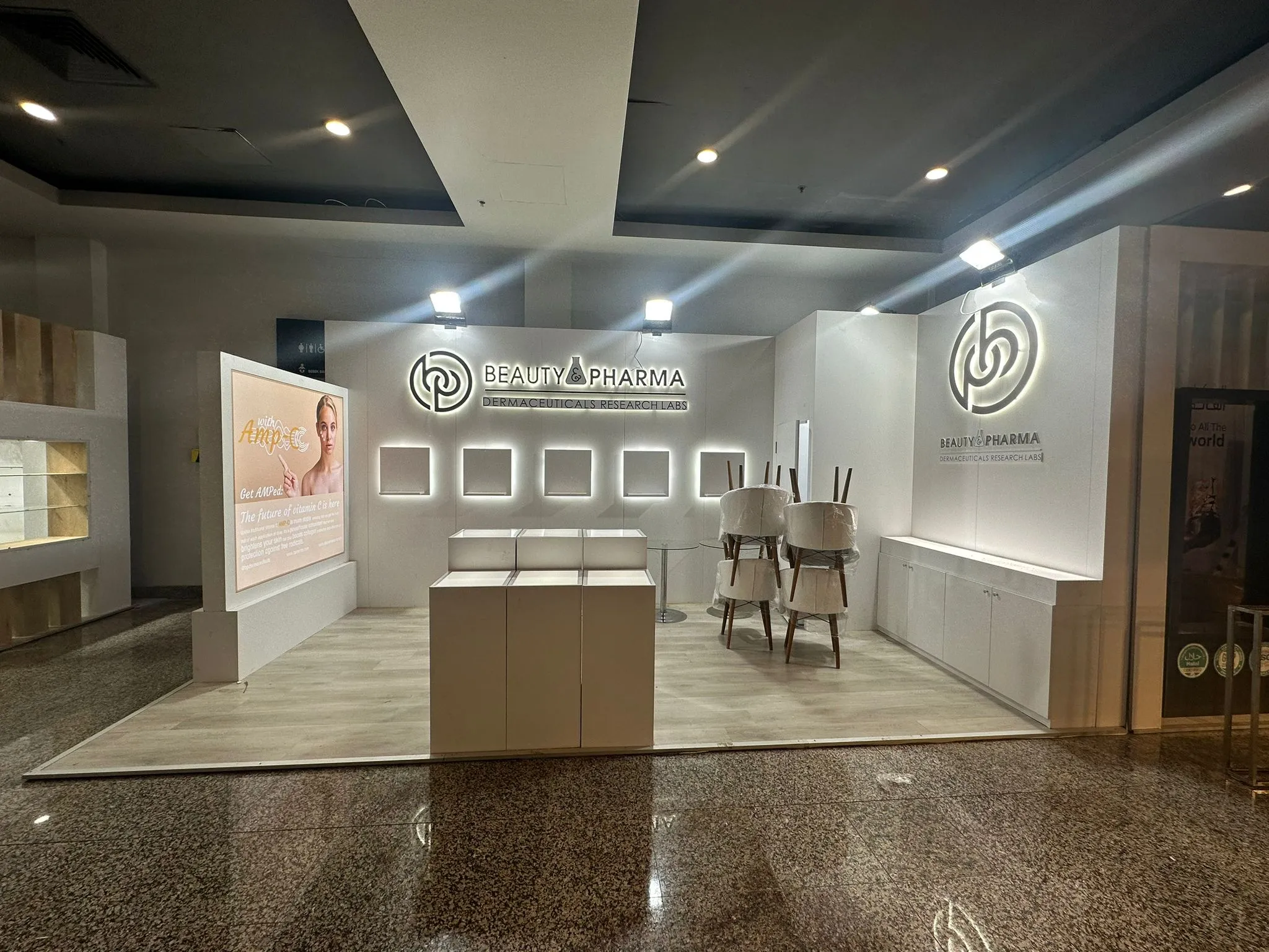 Beauty Pharma markası için temiz, profesyonel ve güven veren bir fuar stand tasarımı hayata geçirildi. Beyaz ağırlıklı renk paleti, modern çizgiler ve ürün odaklı sergileme alanlarıyla sağlık ve güzelliği buluşturan bir marka sunumu oluşturuldu.